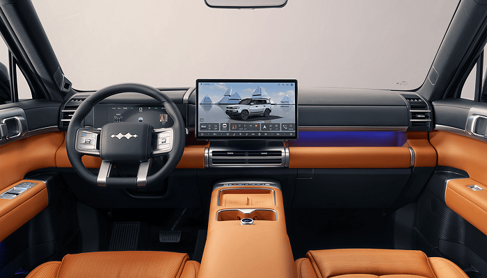 内饰方面,新车采用阶梯式双层中控台布局,配备全液晶仪表和悬浮式中控屏幕,使用怀挡换挡机构。副仪表台区域设有手机无线充电板及杯架。全系标配座椅通风/加热、前排电动调节、W-HUD抬头显示及双无线充电功能,并预留前排座椅背生态接口。高配车型增加车载冷暖冰箱、高级音响系统及香氛装置。