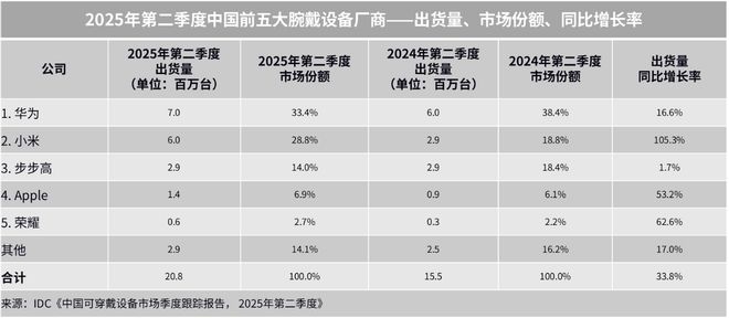 国际数据公司(IDC)的最新报告显示,2025年第二季度全球腕戴设备市场出货量达到了 4922万台。其中,华为表现卓越,以990万台的出货量和20.2%的市场份额,再次荣登全球榜首。而在中国市场,华为更是连续六年稳居霸主之位,市占率高达33.4%,成为当之无愧的“双料冠军”。