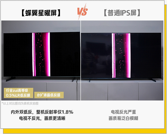 采用行业最高等级的0.5%LR低反膜与89度液晶内低反组成的双低反方案,成为TCLT7LUltra在同级产品中的核心优势,整机低至1.8%超低反射率,能够确保电视无论白天黑夜,无惧外界环境光干扰,显著低于同级产品AGLR屏的2.6%反射率,相较磨砂屏方案画质表现也更加通透,画面纯净不泛白,观影清晰更沉浸。此外,蝶翼星曜屏还具备7000:1原生对比度,是普通IPS(1200:1)屏幕的五倍以上,暗场画面细节更丰富,色彩层次感也更好