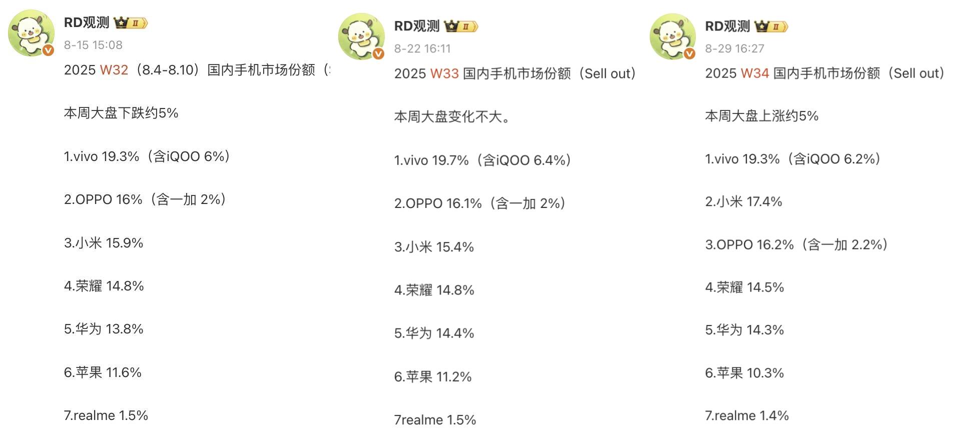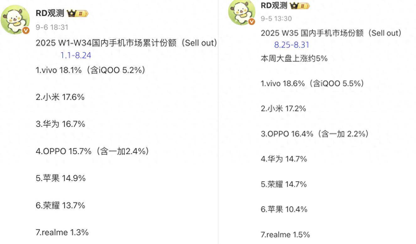 排名第二的是小米,它的市场份额为17.6%,同时在W35榜单中也排名第二,和第一名的差距为0.5%。还有一个被大家忽略的数据,小米比第三名高出0.9%,并且在W35榜单中华为排名第四。根据最新的爆料,小米16系列将在9月底发布,红米K90系列和红米Turbo5系列也将在春节前发布,所以小米还有时间和机会反超,目前看到的局面是保二争一。