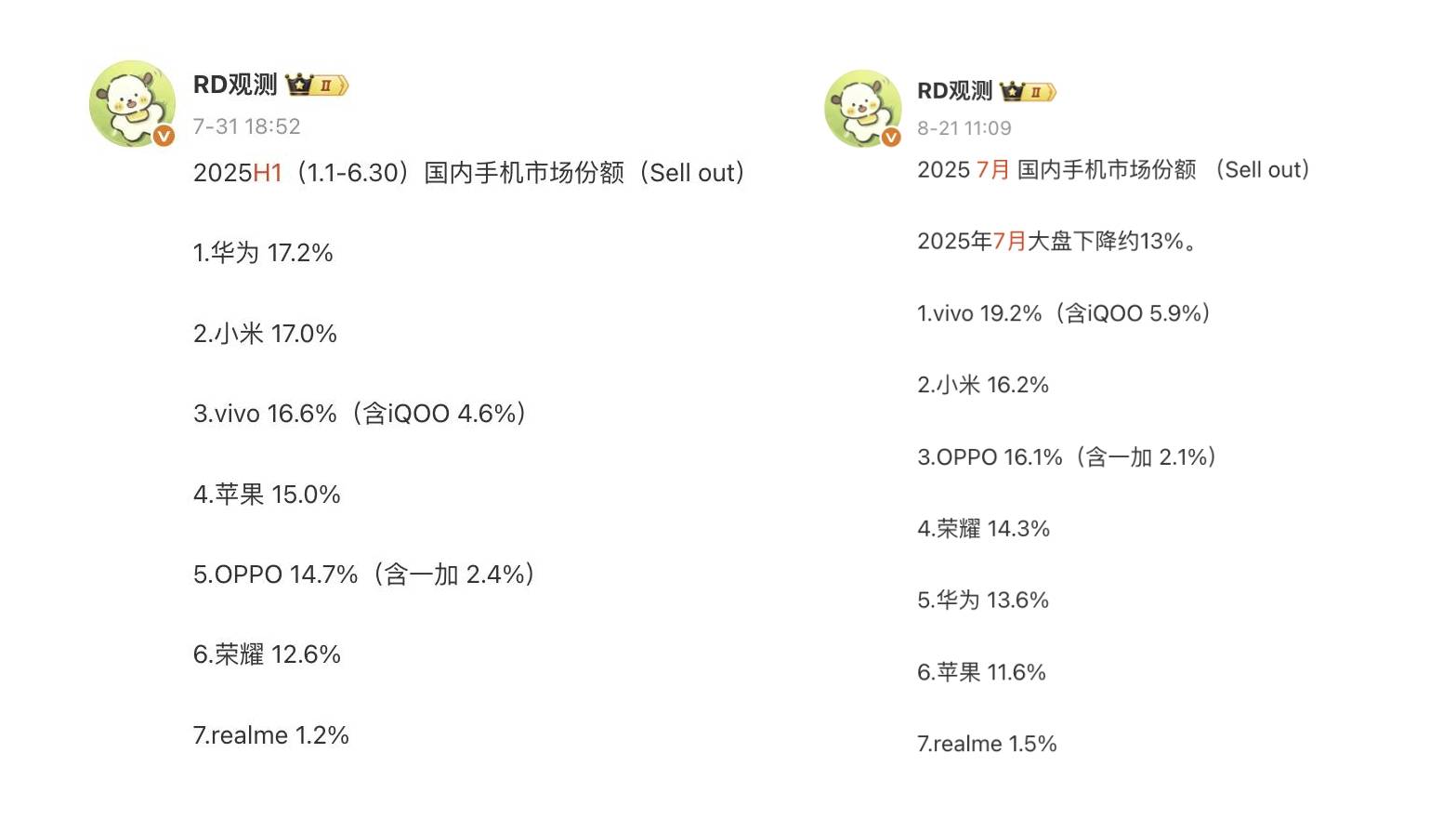 昨天有粉丝问前8个月的手机榜单,今天它来了,不过数据还是需要严谨一下,这是2025年前34周(14.12.30-15.8.24)。为了更严谨,亓纪附上了W35(8.25-8.31)榜单,结合具体数据来看的话,对榜单排名几乎没有任何影响,以下是榜单的详细内容。