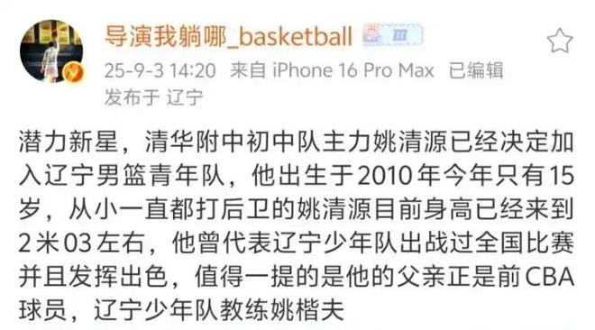 据知名媒体人导演我躺哪爆料,辽宁男篮已签下2米03新星姚清源,姚清源是辽宁男篮四队主教练姚锴夫的儿子,目前在清华附中打球,虽然目前司职前锋,但从小在父亲的教导下,练的是后卫技术,控运娴熟,相信加以培养,会是辽宁男篮未来锋线希望之星。在张镇麟离队、韩德君退役后,辽宁男篮近几年都不在争冠期,与姚清源同龄的辽宁籍球员里,邵永哲已与辽宁男篮签订多年合约,姚盛彬与赵博新还未与任何球队签约,因此辽宁球迷希望俱乐部能够在青训梯队多招进些潜力新人,并在一线队大胆锻炼年轻球员,为未来重新崛起积聚力量。